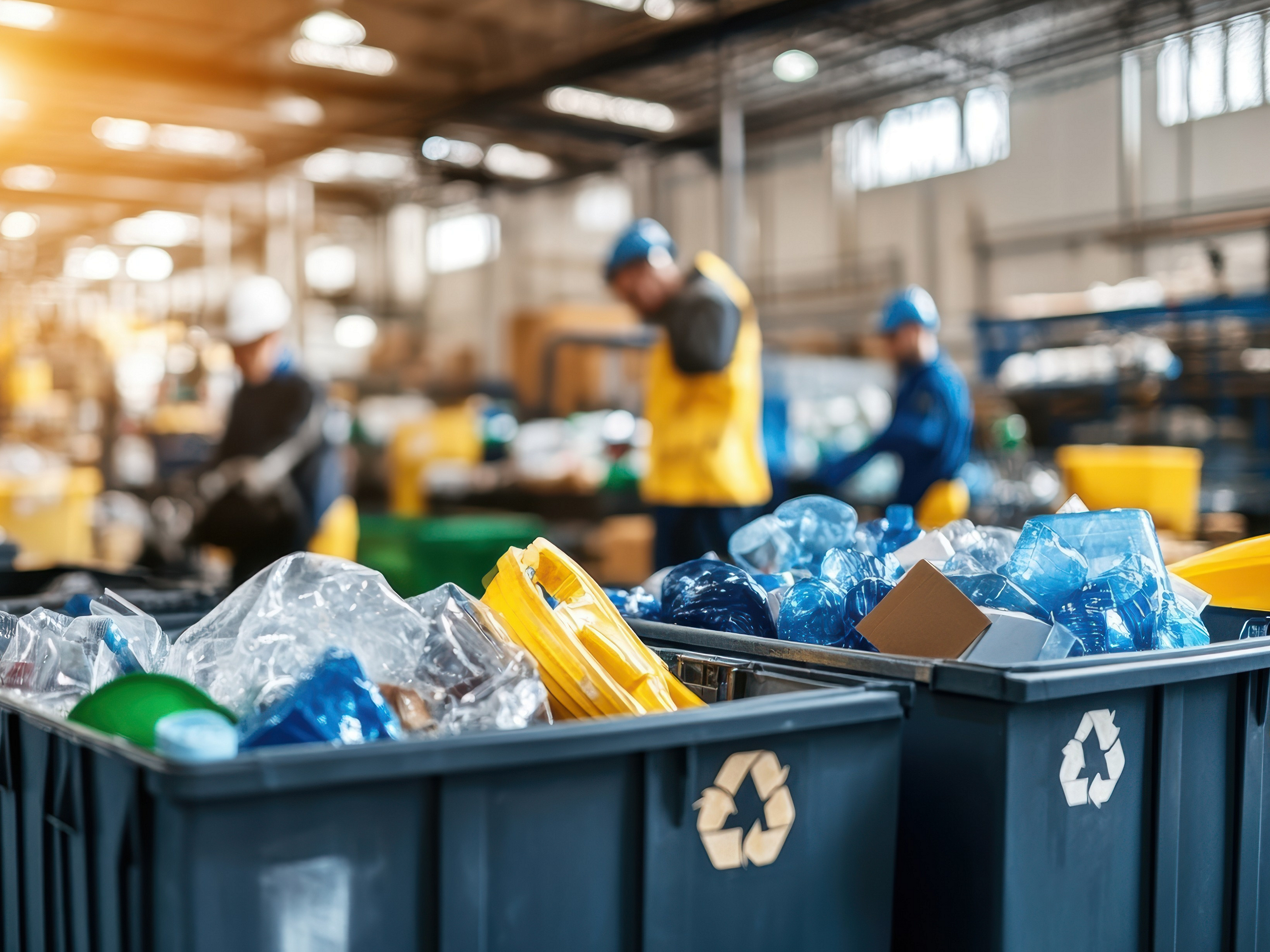 Arbeiter in einer Abfallverarbeitungsanlage sortieren Plastikflaschen und -behälter in Recyclingbehälter und fördern so Nachhaltigkeit und Umweltverantwortung.